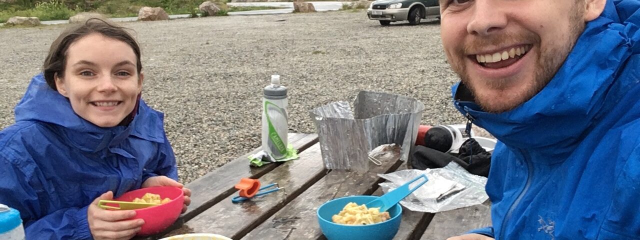 Minutes after we arrived in Senja it started to rain fairly hard. We quickly got into our rain gear and found that our only option to cook dinner was to do so under cover of the portable toilet. We had cheese and broccoli pasta with chorizo and finished just in time to get the final sailing, at 8:47pm, to Botnhamn.